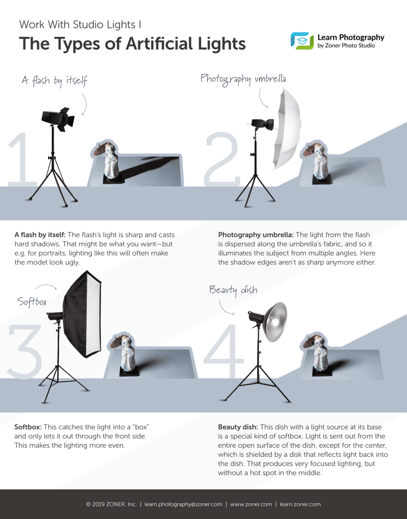 In the first of this pair of practical infographics, we’ll explain the differences among different types of studio lighting. Read it, and you’ll never be surprised by terms like “beauty dish,” “umbrella flash,” or “softbox” again.