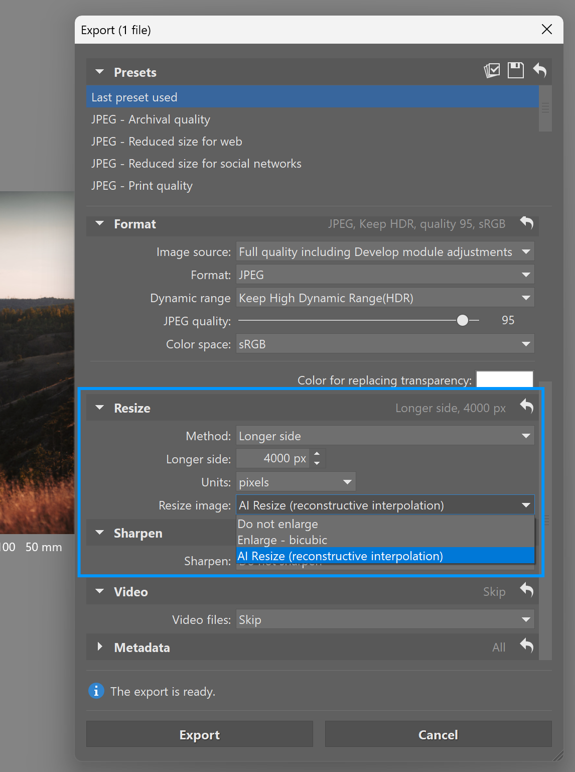 It’s ideal for everyday work, like exporting to higher resolutions or preparing images for print. It works quickly and is now the default method for resizing during export.