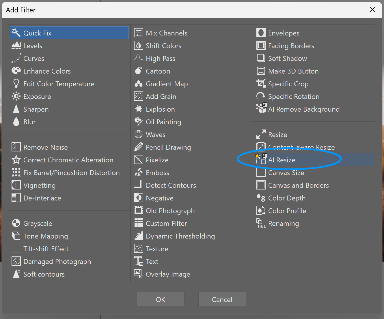 In Batch Filter, you can resize large numbers of photos at once.