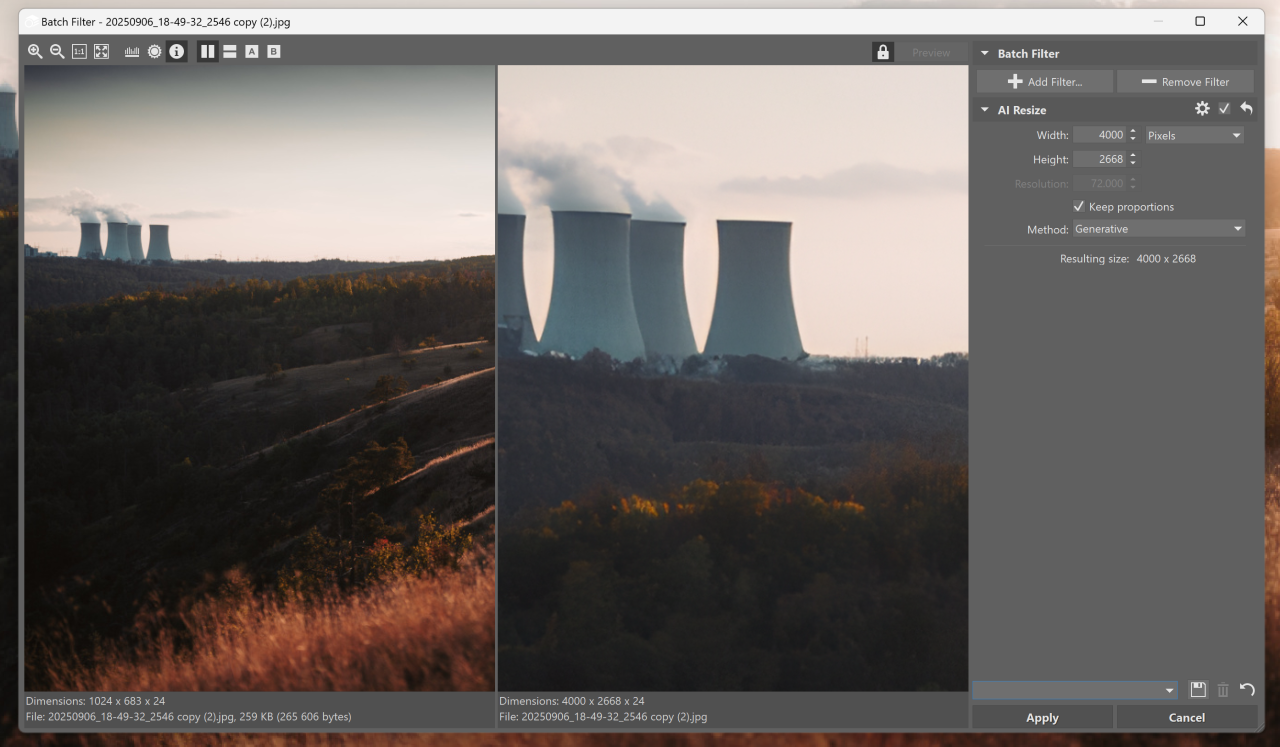 Both methods run locally on your computer. There’s no uploading to the cloud, and no waiting. Reconstructive Interpolation works quickly even with batch exports and doesn’t overload your computer. The Generative method is more demanding in terms of performance, but useful when classic enlargement isn’t enough.